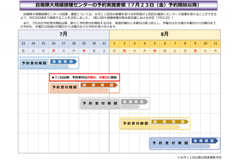 自衛隊大規模接種センターでは、9月25日頃まで接種を行なうとしており、毎週月曜日と木曜日の週2回予約を受け付ける。 詳細は 予約・受付案内のページ に掲載されており、次回は7月29日 (木曜)に開始する。